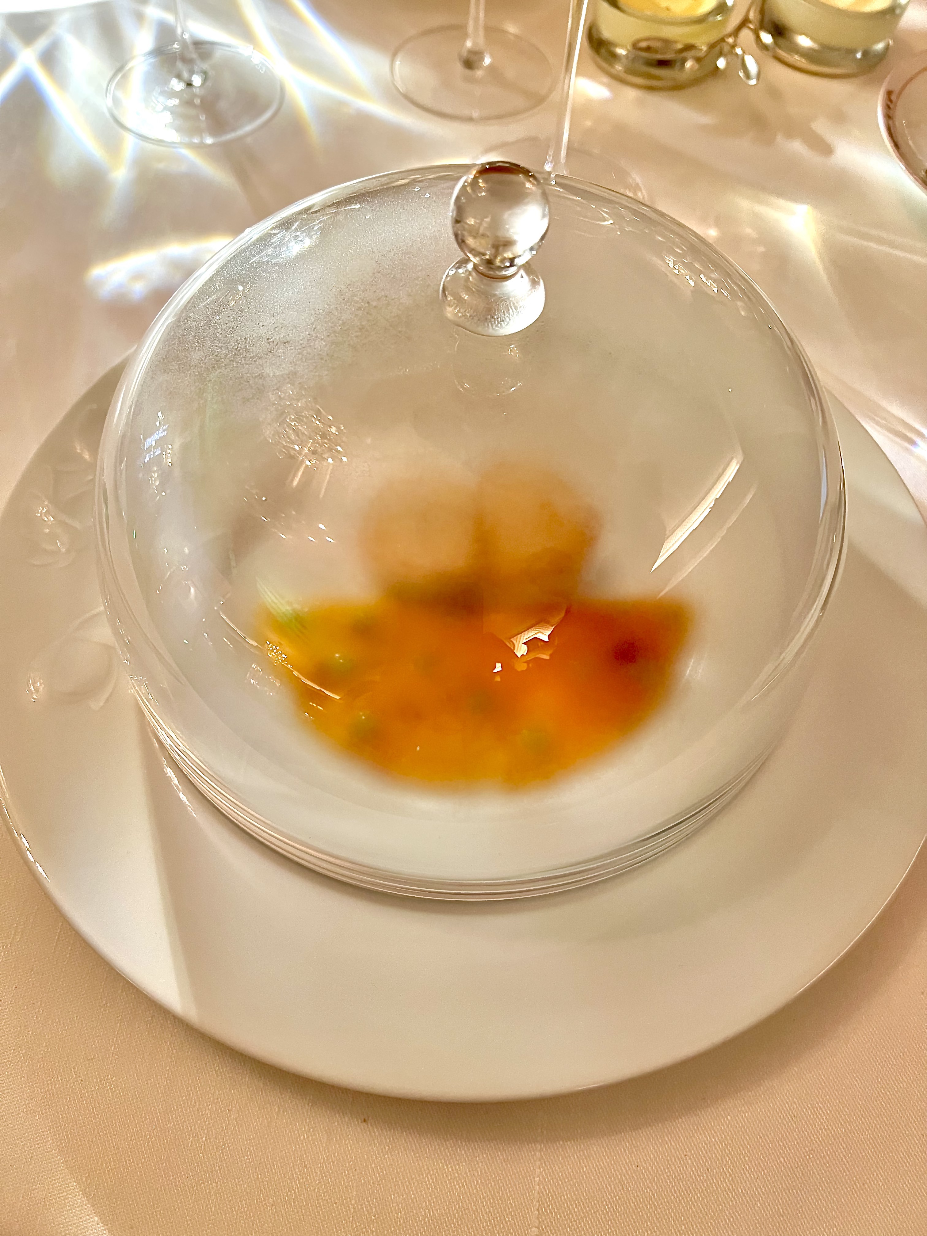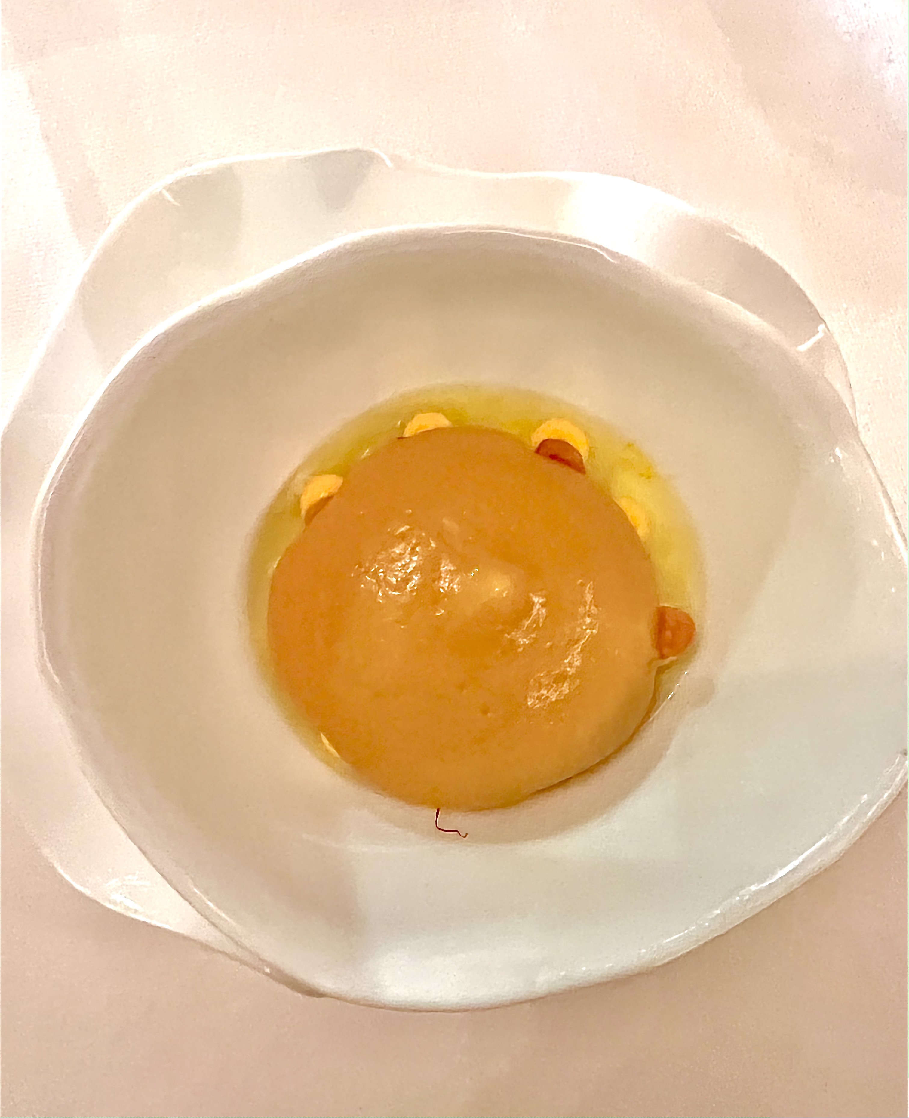 The pre-starter immerses you in the depths of the Mediterranean, riso pasta and saffron petals trapped in lemon jelly, topped with siphoned rock fish soup. In a single spoon, one finds all the traces of a real soup in fishermen tradition, but here in a powerful and concentrated version, with intense relief. The lemon revives and energizes everything, the parmesan croutons bring the gourmet crunch and are fleshed out in harmony with the saffron flower, like a rouille. It’s vibrant, sincerely impactful and just rightly awakens the taste buds.