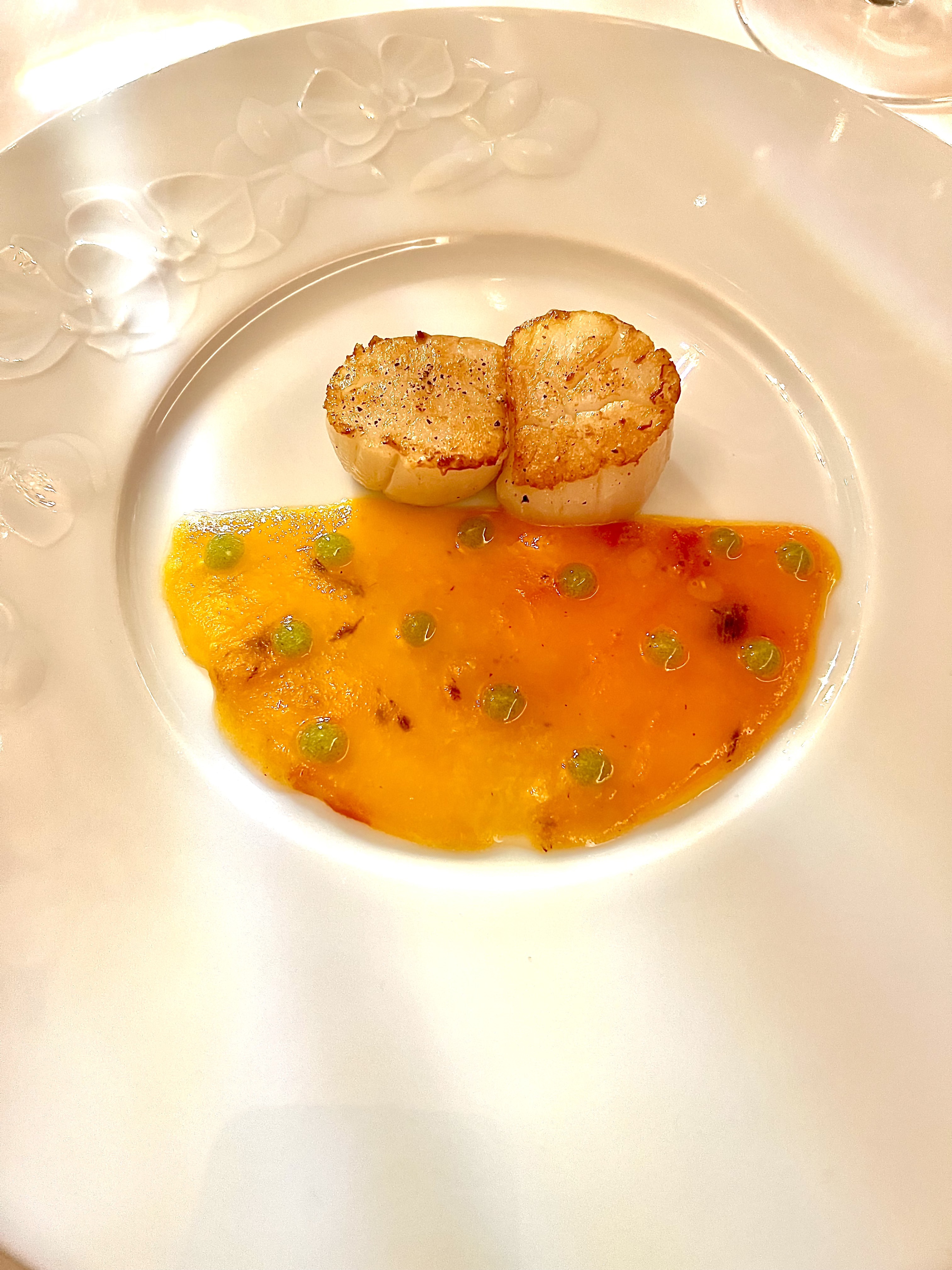 Scallops from the Baie de Seine, fresh persimmons from Golf-Juan and tarragon condiment: cooked like meat on the barbecue, with a balanced smoked edge, the scallops captivate by their texture and flavor, between power and subtlety. The persimmon coulis brings its benefactor paradox, astringent and honeyed at the same time, it is pricked with tarragon gel for a perfect herbaceous harmony precipitating the Saint-Jacques in a dimension of the sublime.