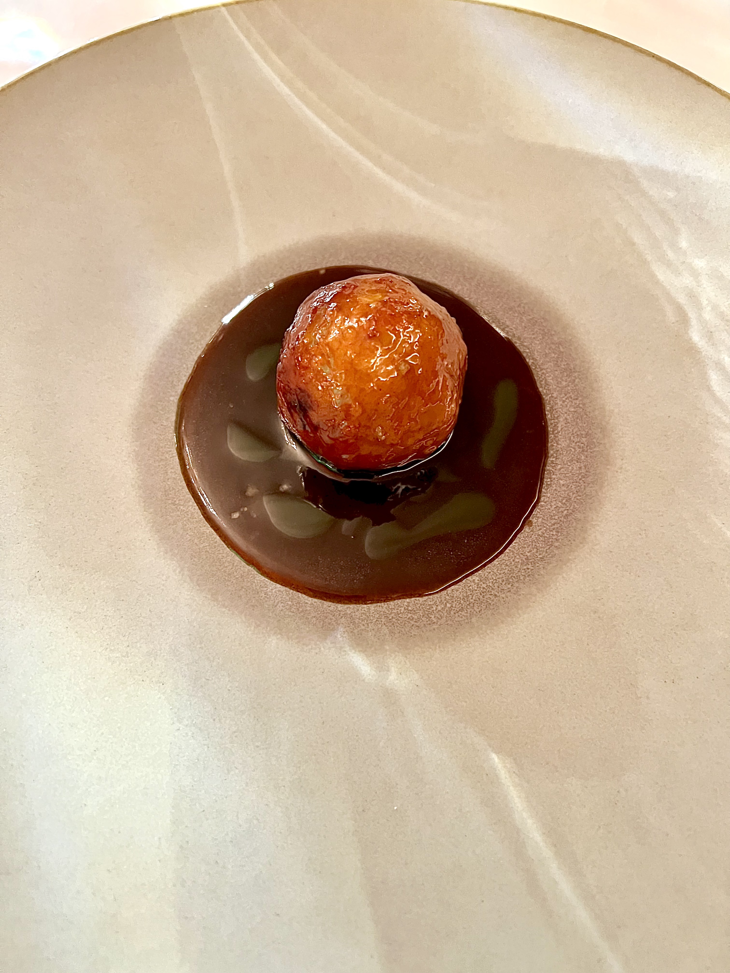Agnès’ celeriac lacquered with heather honey, Ethiopian coffee steamed bread with leaves: everything begins in the first service with the steamed bread with celery leaves, this small smooth green rounded ball is reminiscent of a Gourmet Bao stuffed as a surprise with a brunoise of celery which acclimatizes the palate for the next step, it’s greedy and playful at the same time. Then comes celeriac, round and perfect in appearance, reminiscent of that great Indian delicacy, Gulab. The celery is roasted and stewed like a piece of meat, fed with coffee and honey which brings this lacquered side to Asian dishes, with a hoisin sauce, and Kumpot pepper spruces it all up: a concentrate of flavor in maximum reduction of a great personality. Once cuts, one bites, one sauces, one tastes … it’s brilliant, gourmet and joyful.