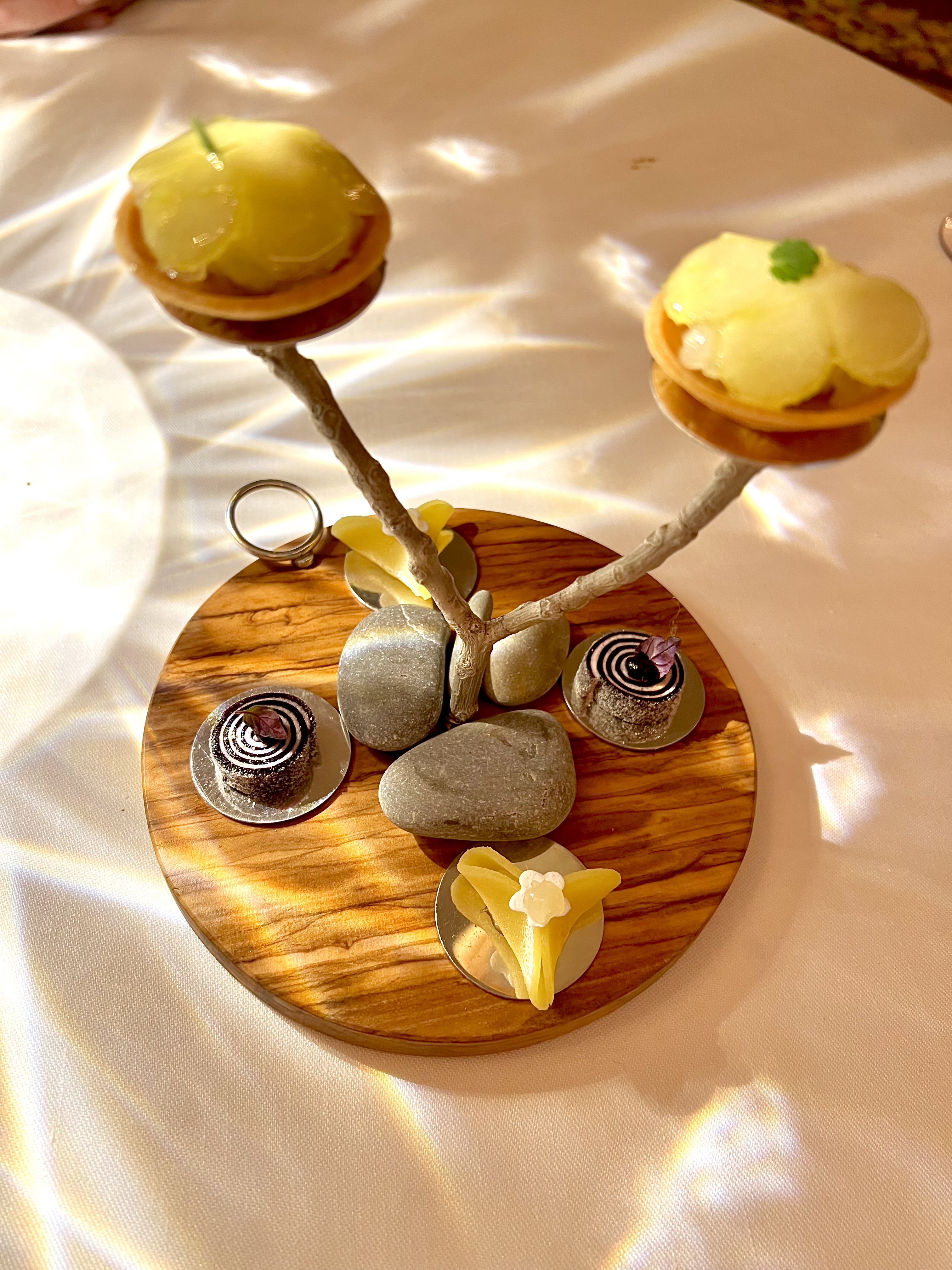 Sweets, presented as mignardises, round off this remarkable, impactful and committed menu.