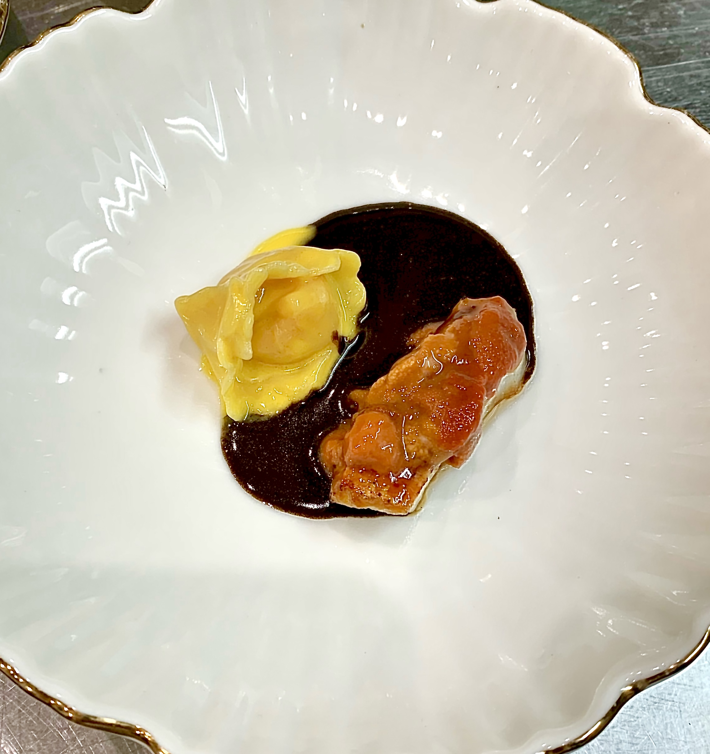 It was Samuel who launched the first phase of tastings with the Gamberi de San Remo in iodine filigree wrapped in the milky sweetness of mozzarella, the prawn head vinaigrette becomes a concentrated condiment and balances the fresh crisp of the spring onion and fennel.