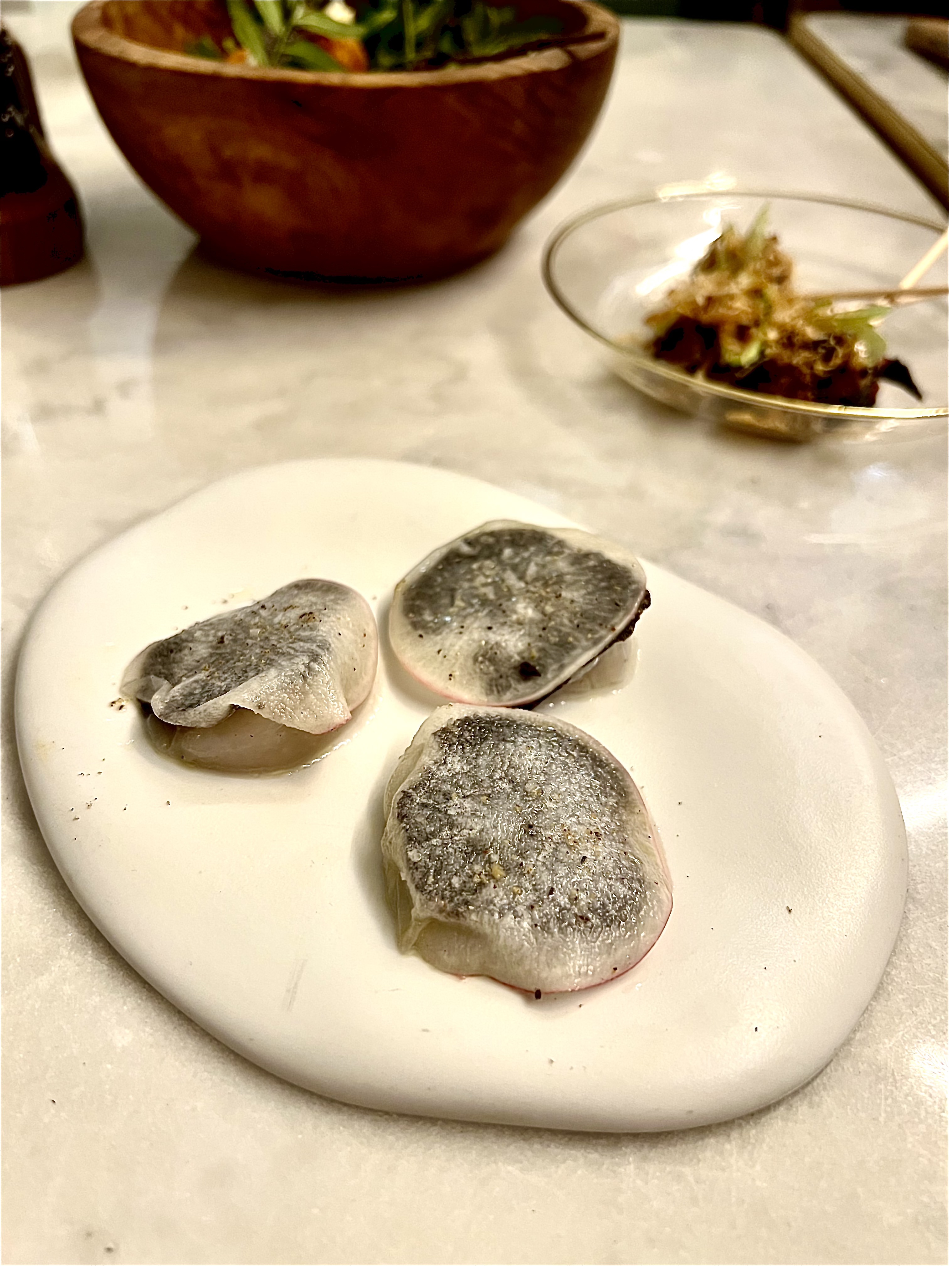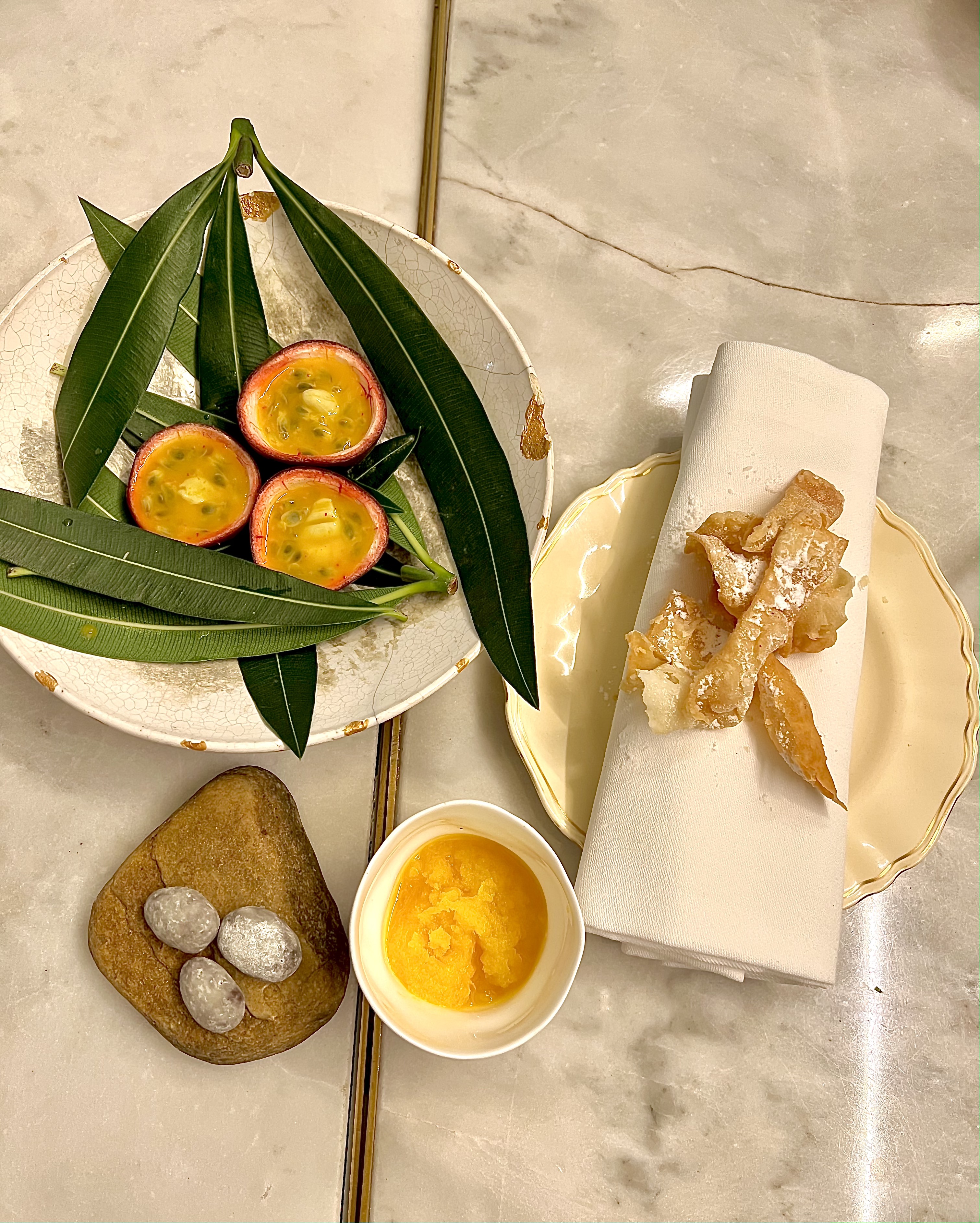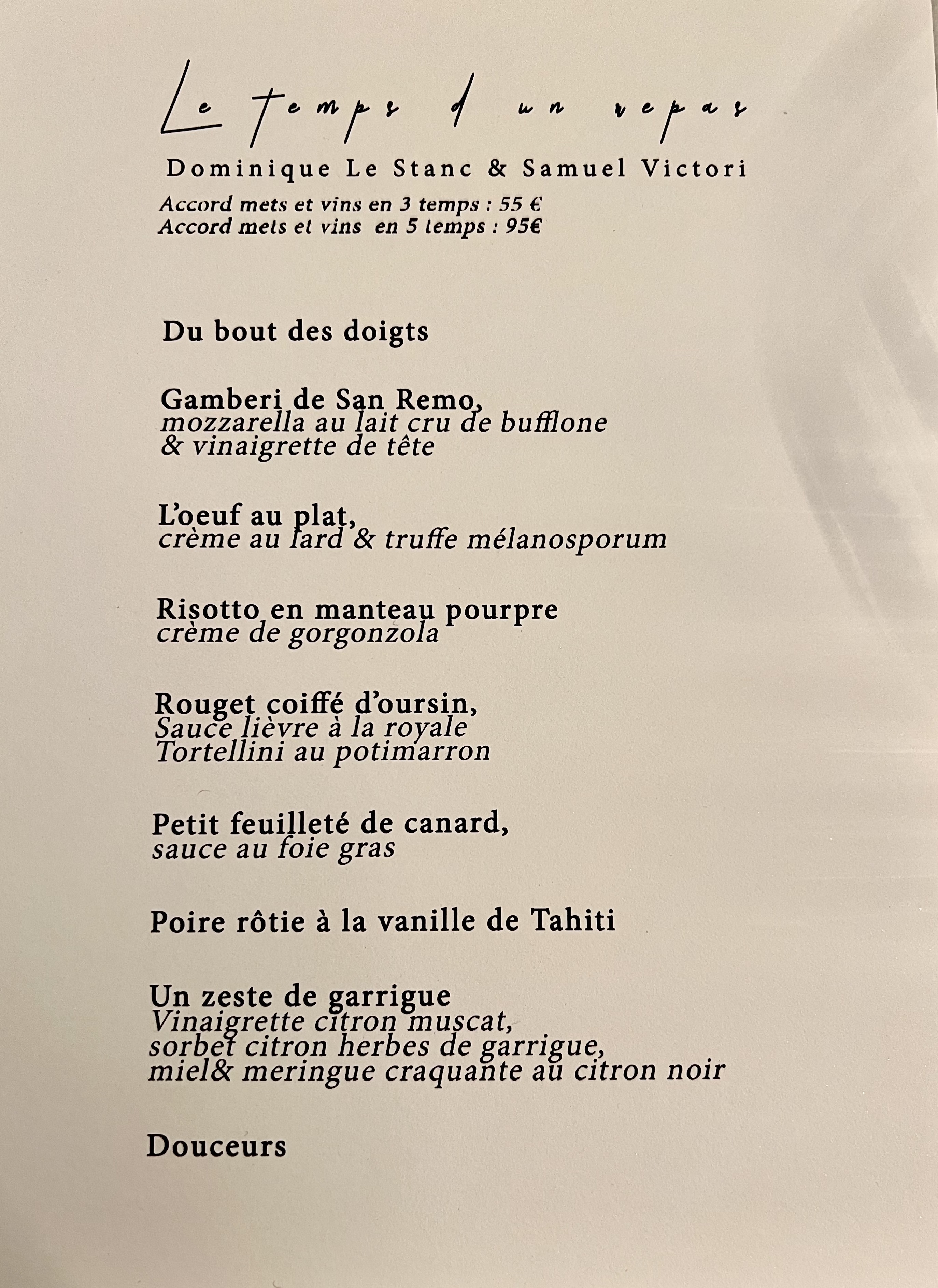 Chefs Samuel Victori and Dominique Le Stanc found themselves with sincerity in this subdued and gourmet menu, a beautiful association of styles in sweet unity.