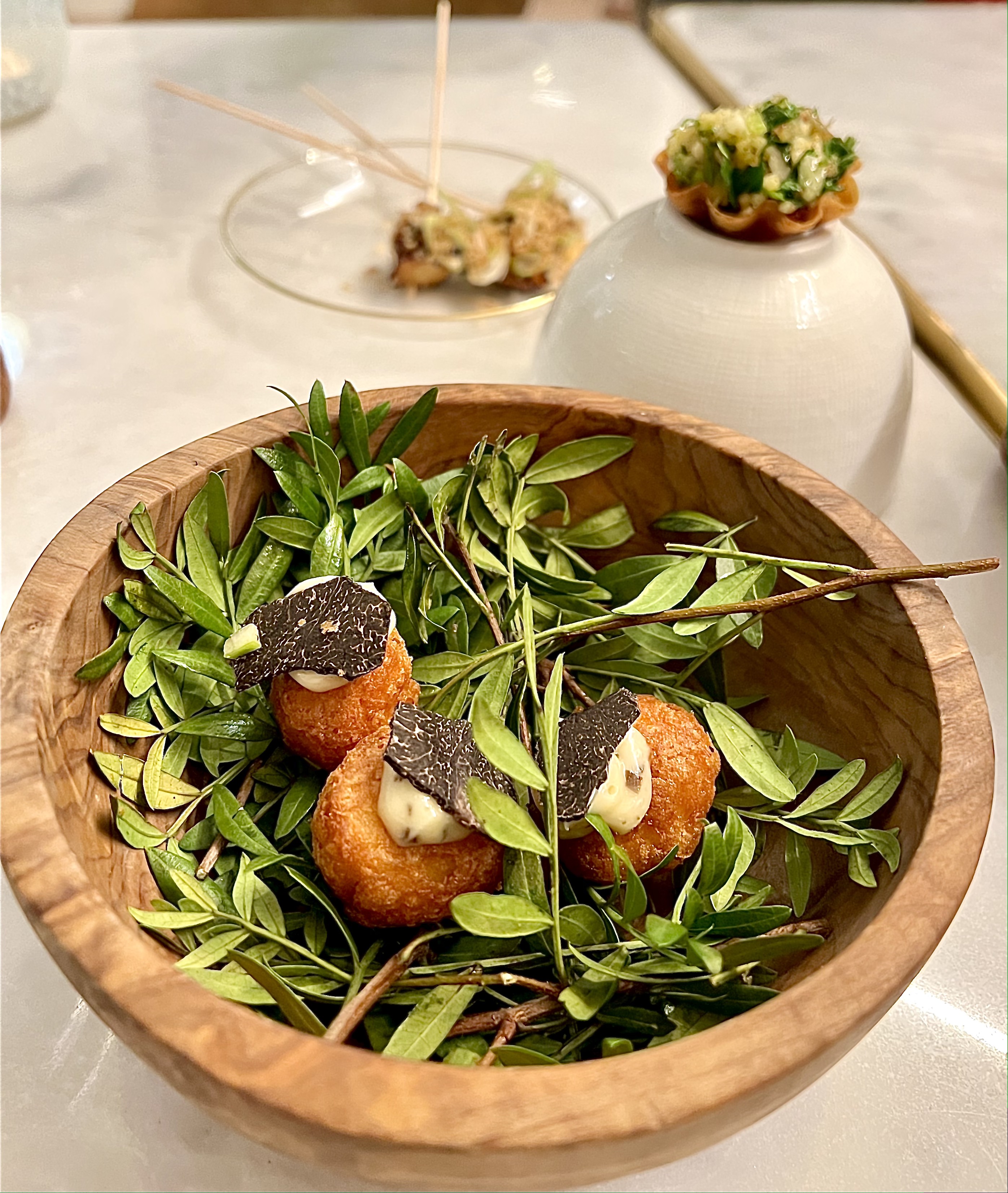 It all started with a brioche to share, delicious to die for in the limbo of gourmet pleasures, served lukewarm, the thin slice of guanciale on top melts with happiness, which releases all its gourmandise. The herbs of the Garrigue enhance the whole thing with the song of the cicadas in your head. The very refined seasonal cocktails are in perfect harmony with appetizers, such as Le Beetroot fizz (Gin 44, beet juice, rose water, tonic, elderflower). Everything can be savored in one delighted and satisfied bite: the smart little dauphine potatoes with truffles, the octopus skewers with the flavor and soft texture of a Takoyaki, the small crispy cushions with goat cheese, honey and lavender, the scallops in its purity, turnip and truffle…