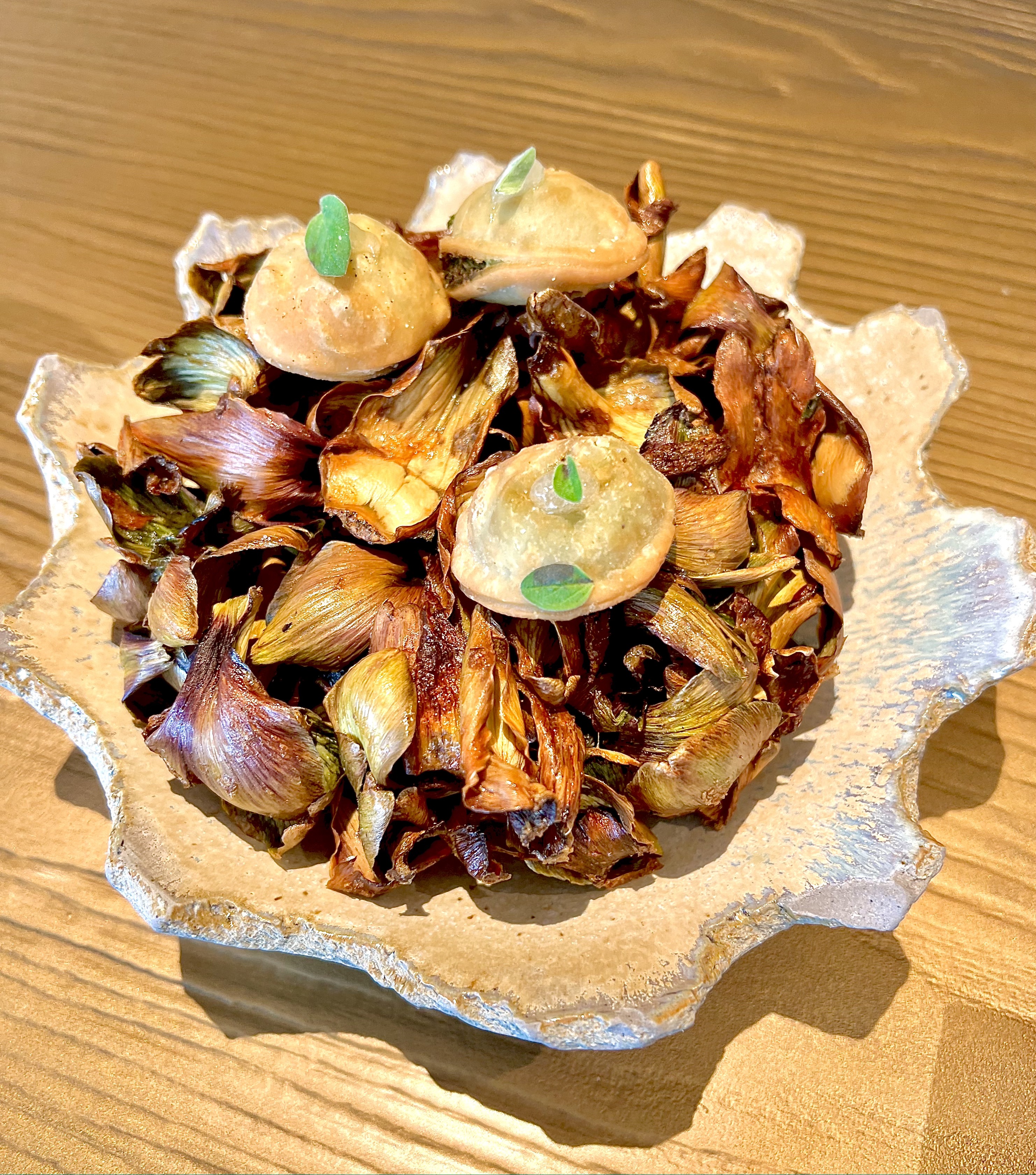 The Badaboum style Egg with caviar, poached, smoked cold cream, toasted bread, bears its name so well when tasted that your heart goes boom. The egg, cut in front of you by the chef, pours out pleasure on your plate, the caviar, as an insert, is released tenderly enveloped by the yolk. You feel rising in you this instinct of no longer being able to control yourself from waiting any longer and there you are, biting with delight in this almost indecent bite of « umami » pleasures, the crispy eel fat dip « agraves » your wonderful condition. The sorrel comes to titillate you with its perfect acidity: a vibrant tribute to the Frères Troisgros.