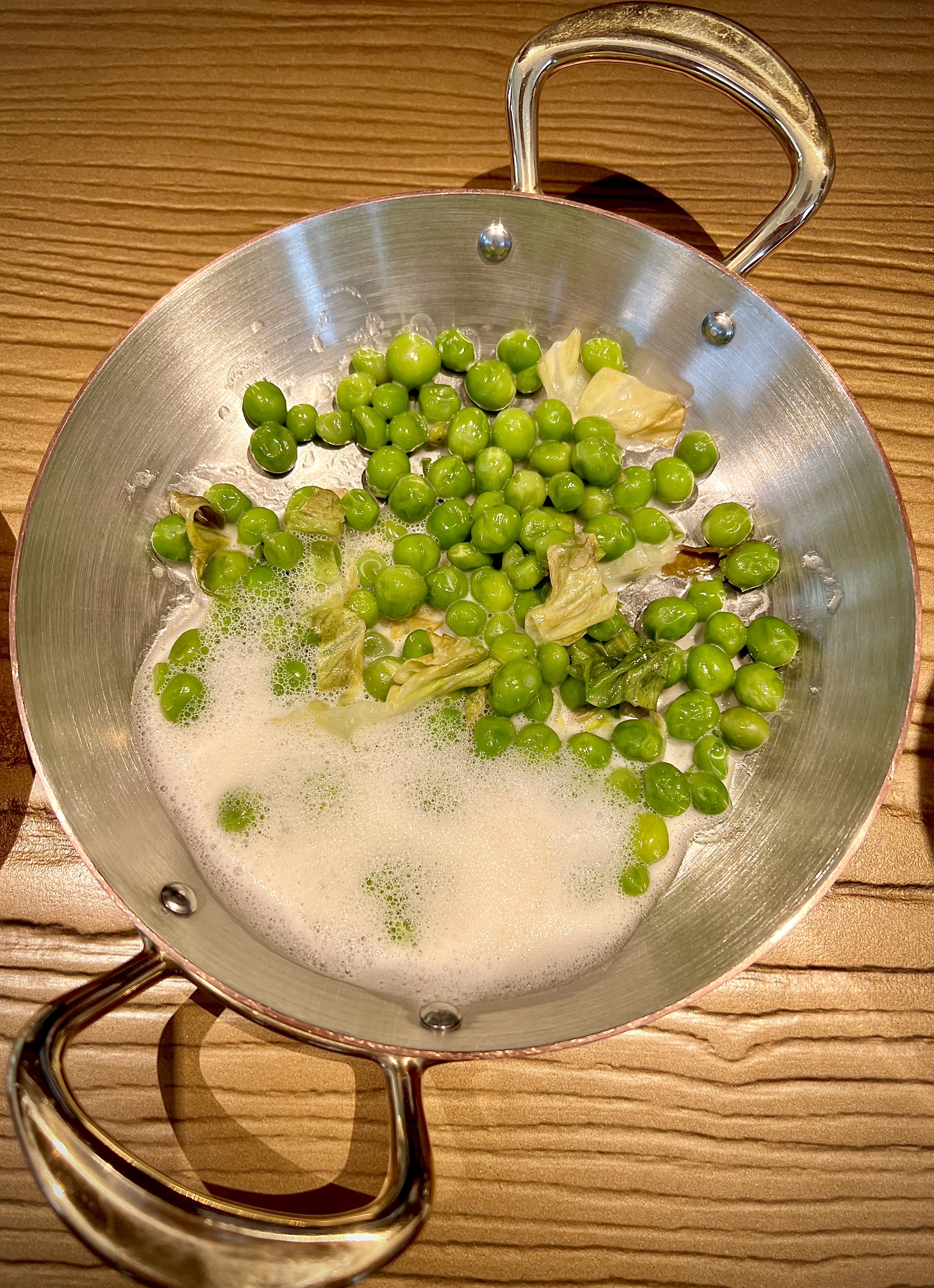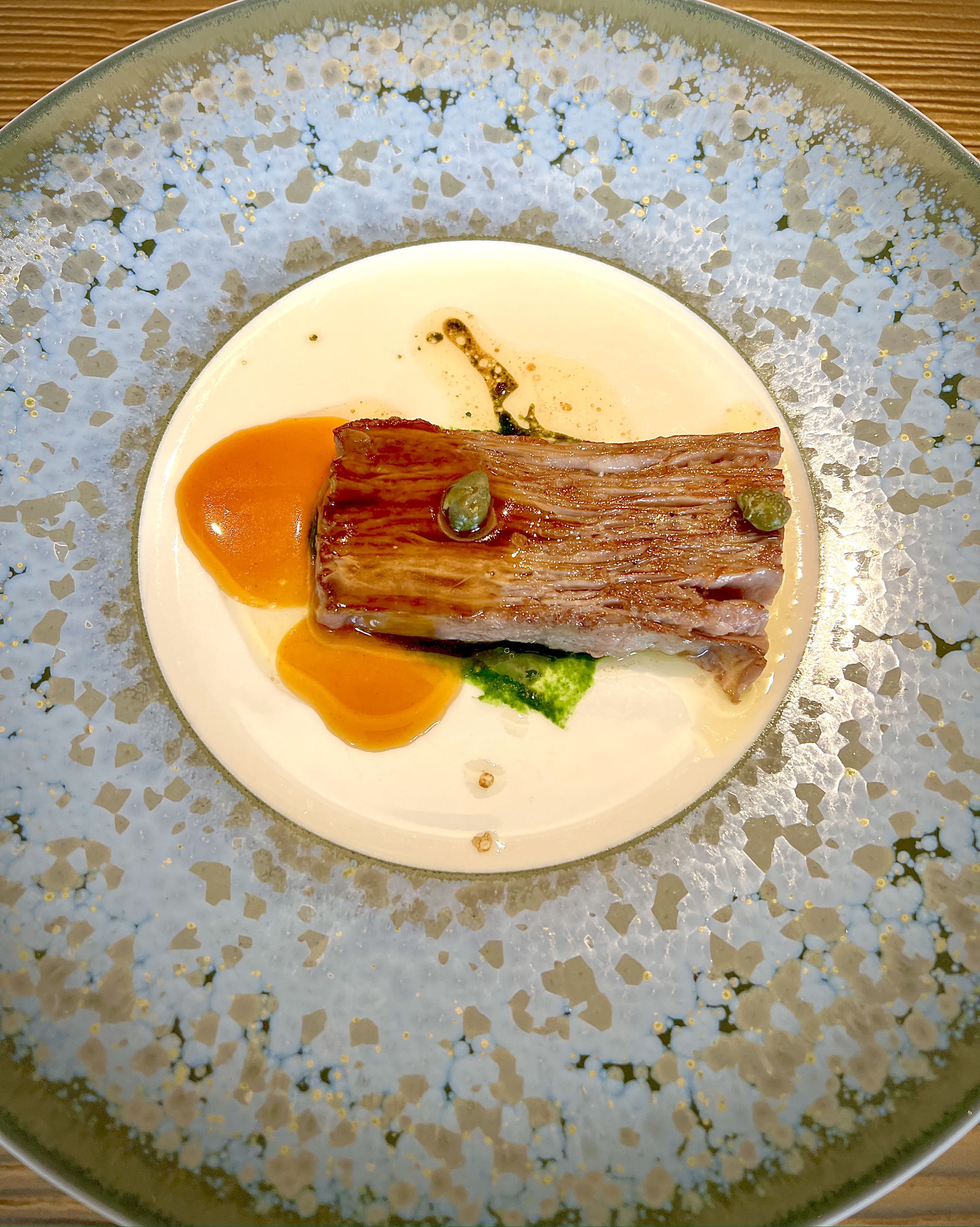 Millefeuille layering of Wagyu beef with Paris mushrooms, capers and mushroom juice, is one of those unforgettable dishes that remain forever etched in your taste memory. The grade 4 Wagyu beef from Kyoto district is expertly mounted sheet by sheet, with fine strips of meat interspersed with button mushrooms which, when cooked, take on the noble fat of this unique piece . The cut is dizzying with these slices which open up like a range of flavors and reveal the prodigious cooking. The parsley puree and meat jus, celery and caper extraction combine with passion to wonderfully energize the palate. The peas play their slamming and springtime score and are numbed with emulsified lemon-flavoured Beurre-Blanc. The counter of gourmets present that day vibrated unanimously with this forever suspended moment. A real standing ovation from the senses.