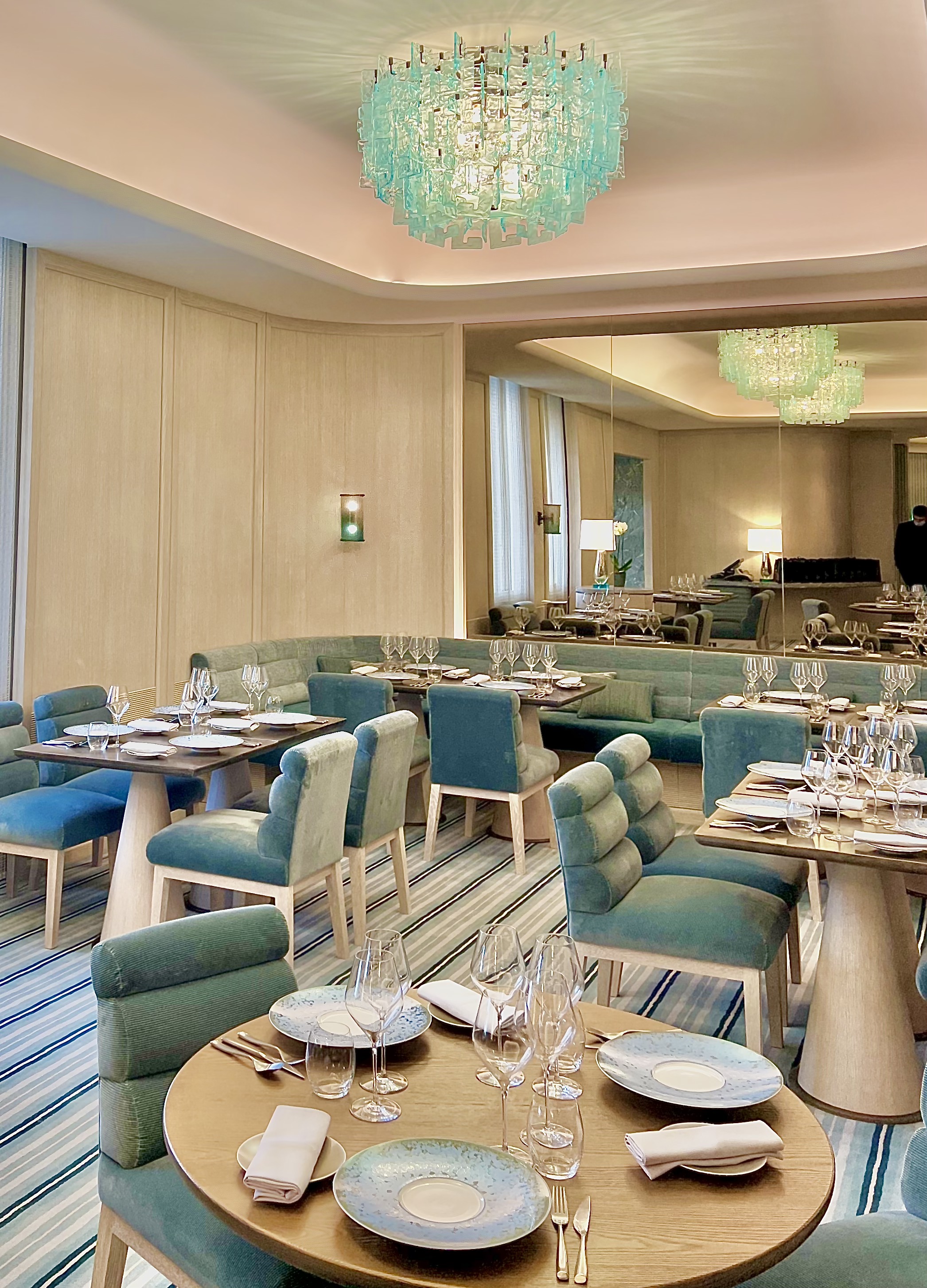 The superb counter, with endless azure shades of its elegant elliptical shape, echoes the unforgettable view that is an integral part of the premises. The decoration, signed Chahan Minassia, has the spirit and soft warmth of a private residence.